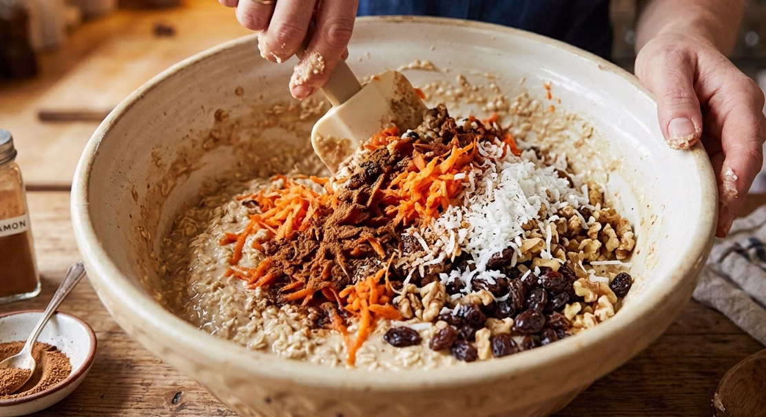 - Next, I fold in the grated carrots, cinnamon, nutmeg, shredded coconut, walnuts, and raisins. This step ensures the oats absorb all the delicious flavors.