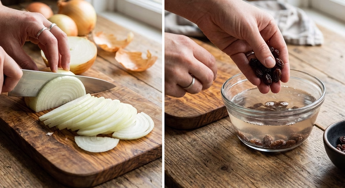 I start by slicing the onions evenly into half-circle strips. This helps them cook uniformly. I soak the raisins briefly in warm water to plump them up, which keeps them soft and juicy in the dish.