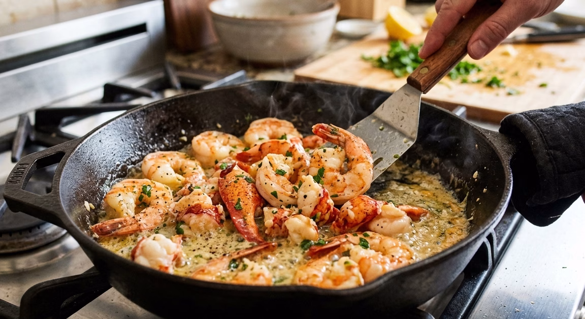 In the same skillet, sauté shrimp and lobster in butter for a few minutes until fully cooked. Be careful not to overcook, as seafood becomes rubbery quickly. Set aside once tender and juicy.