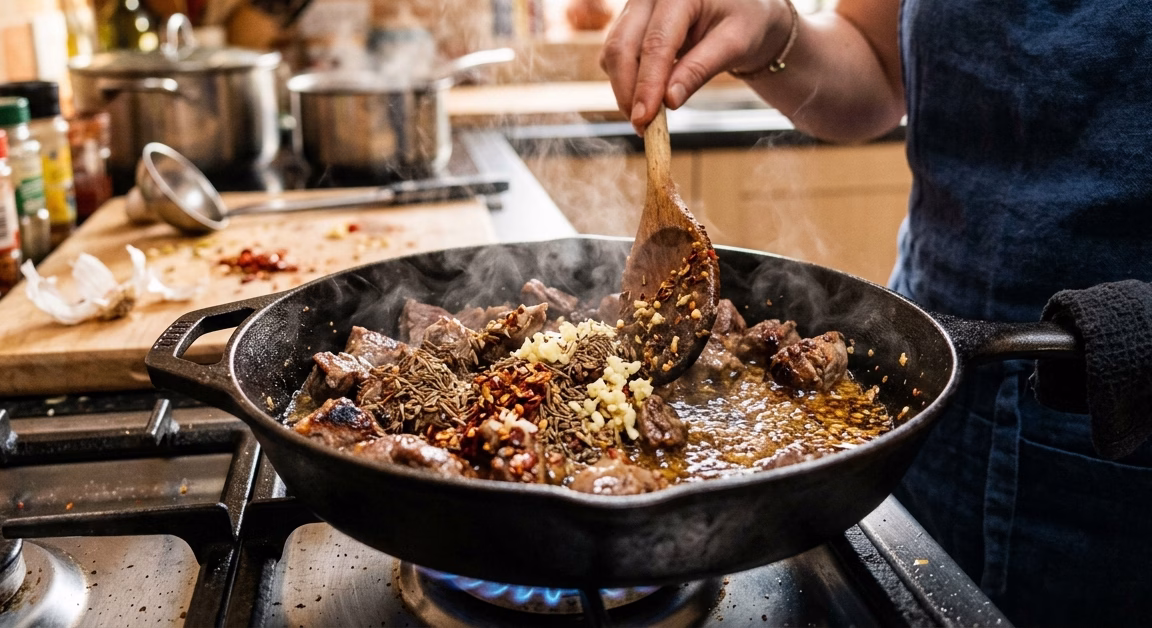 Once the lamb is cooked, add cumin seeds, minced garlic, and chili flakes. Stir everything together and let the spices toast slightly in the oil.