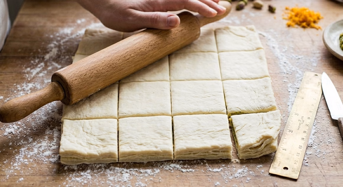 I always start by making the filling first so flavors can blend well. Ground pistachios are mixed with sugar, orange zest, and butter. This creates a thick, aromatic paste that smells absolutely amazing.