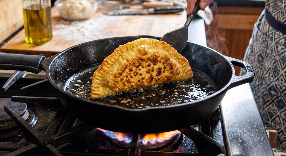 I heat a cast iron skillet with a little olive oil. Each folded dough goes on the pan for 2–3 minutes until the bottom crisps. This step ensures a perfect texture without sogginess.