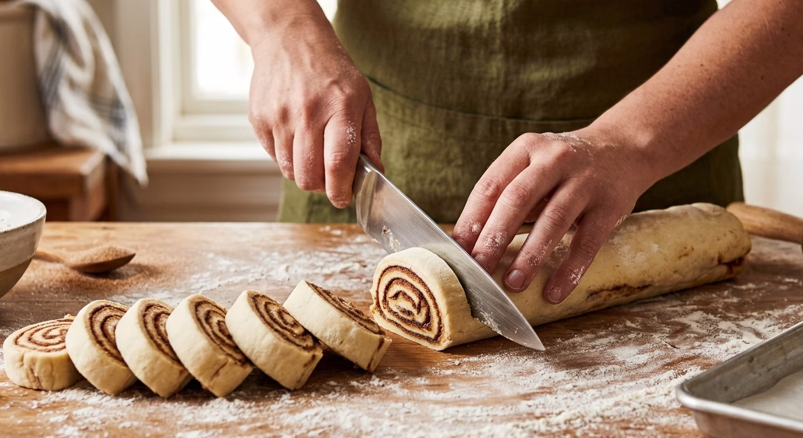 - Next, I tightly roll the pastry into a log, keeping it firm so it holds shape. Using a sharp knife, I slice it into even rounds. I try to keep each piece about 1 inch thick for the perfect size.