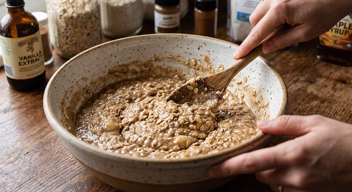 I mashed the bananas and added them to a bowl with the blended dates and milk. Then I stirred in oats, oat flour, vanilla, cinnamon, salt, baking powder, and optional maple syrup until fully combined.