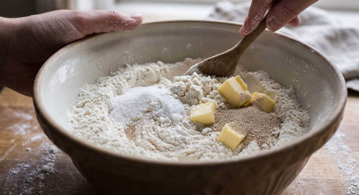 Start by mixing the bread flour, sugar, salt, butter, and yeast. Knead until smooth and elastic. Let the dough rest until it doubles in size.