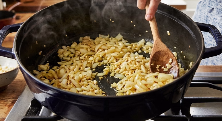 - Heat olive oil in a large pot and add garlic and onions. Sauté until they become fragrant and translucent, about 5 minutes. This step builds the base flavor for the stew, so don’t rush it.